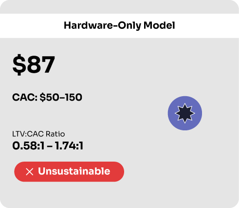 The fundamental issue lies in the economics of one-time hardware sales versus recurring subscription revenue. Modern business theory emphasizes that Customer Lifetime Value (LTV) should be at least 3x higher than Customer Acquisition Cost (CAC) for a sustainable business model [10].