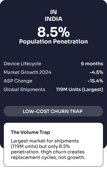 Largest market for shipments (119M units) but only 8.5% penetration. High churn creates replacement cycles, not growth